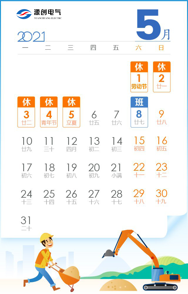 5月1日至5日放假調休,共5天。4月25日(星期日)、5月8日(星期六)上班。