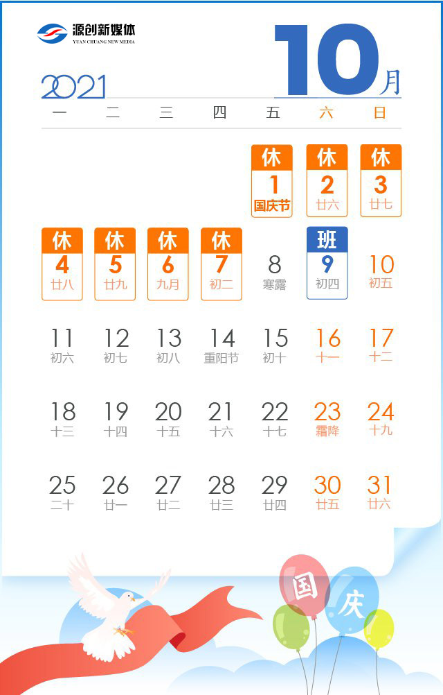 10月1日至7日放假調休,共7天。9月26日(星期日)、10月9日(星期六)上班。