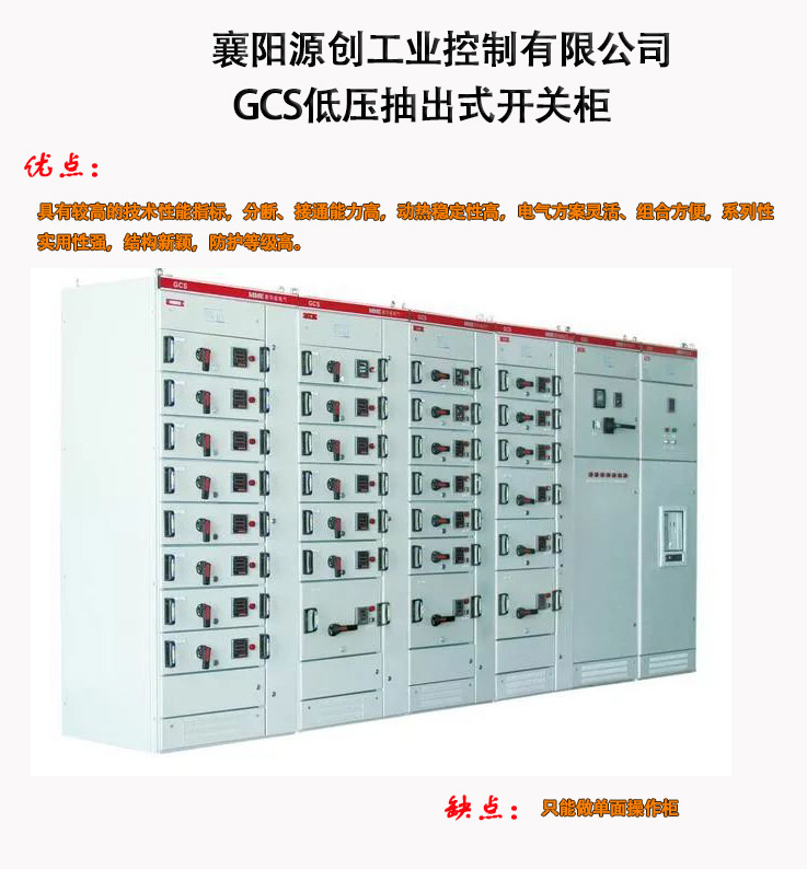 GGD是固定柜、GCK、GCS、MNS是抽屜柜,GCK和GCS、MNS柜抽屜推進機構不同,GCS柜只能做單面操作柜,深800mm,MNS柜可以做雙面操作柜,深1000mm,總的來說抽出式柜較省地方,維護方便,出線回路多,造價貴;固定式相對出線回路少,占地較多,如果客戶提供地點太少,做不了固定式的要改為抽屜式。