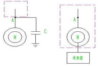 電容并聯(lián)在電機(jī)的前端,其補(bǔ)償范圍是在補(bǔ)償點(diǎn)的前端,沒(méi)有覆蓋后端的電機(jī);進(jìn)相器串聯(lián)在電機(jī)的后端,其補(bǔ)償范圍擴(kuò)大到了電機(jī)。各自的補(bǔ)償范圍如各自的回路圖中虛線框所示。
