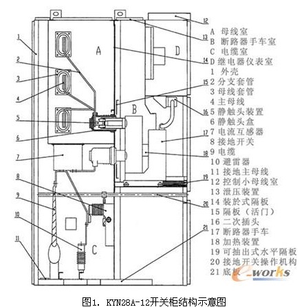 開關柜由固定的柜體和真空斷路器手車組成,這是它的基本結構。開關柜及安裝的電氣元件參見結構示意圖。