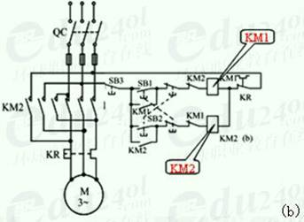 在圖(b)中,當電動機正轉時,按下反轉起動按鈕SB2,它的常閉觸頭斷開,使正轉接觸器線圈KM1斷電,主觸頭KM1斷開。與此同時,串接在反轉控制電路中的常閉觸頭KM1恢復閉合,反轉接觸器線圈KM2通電并自鎖,